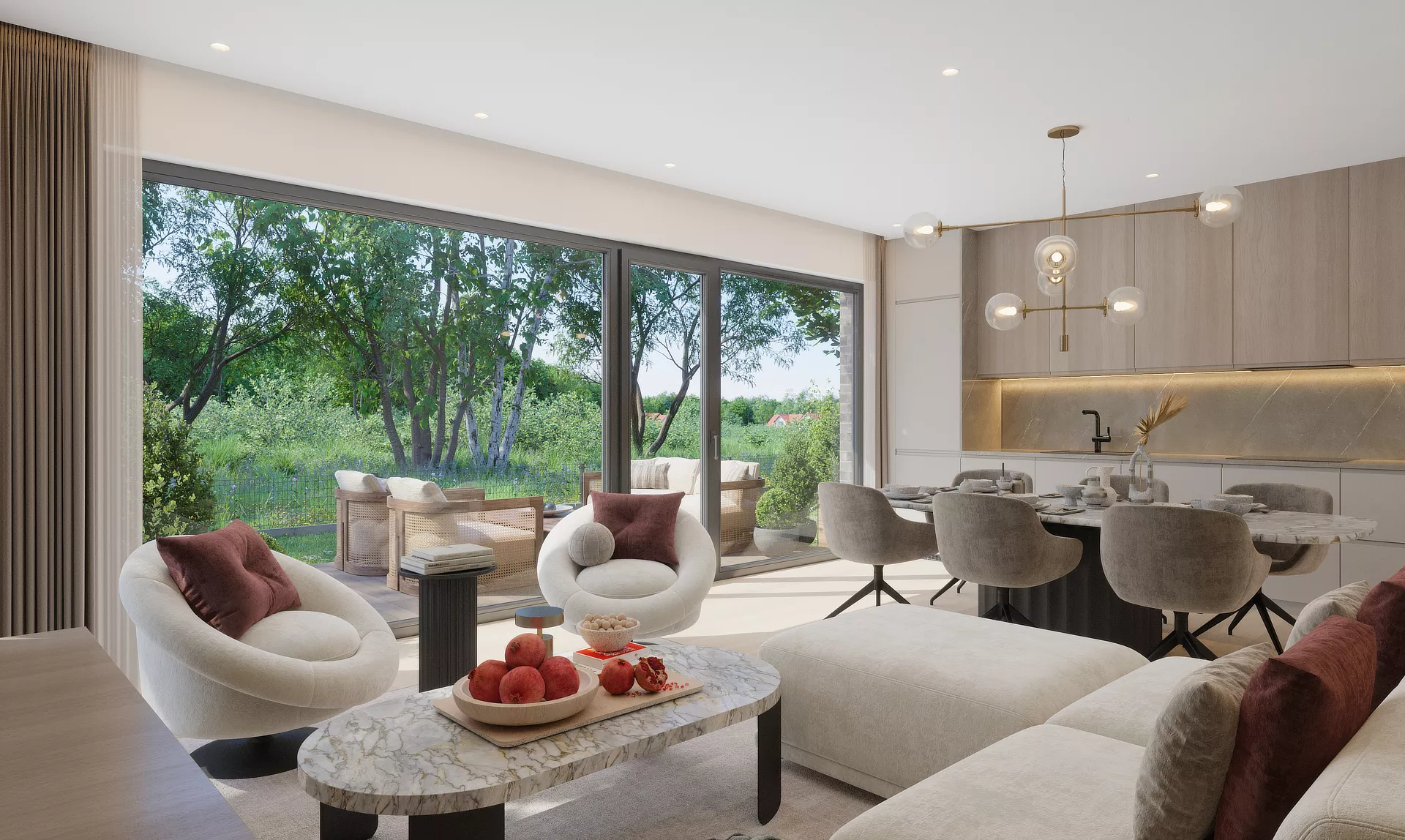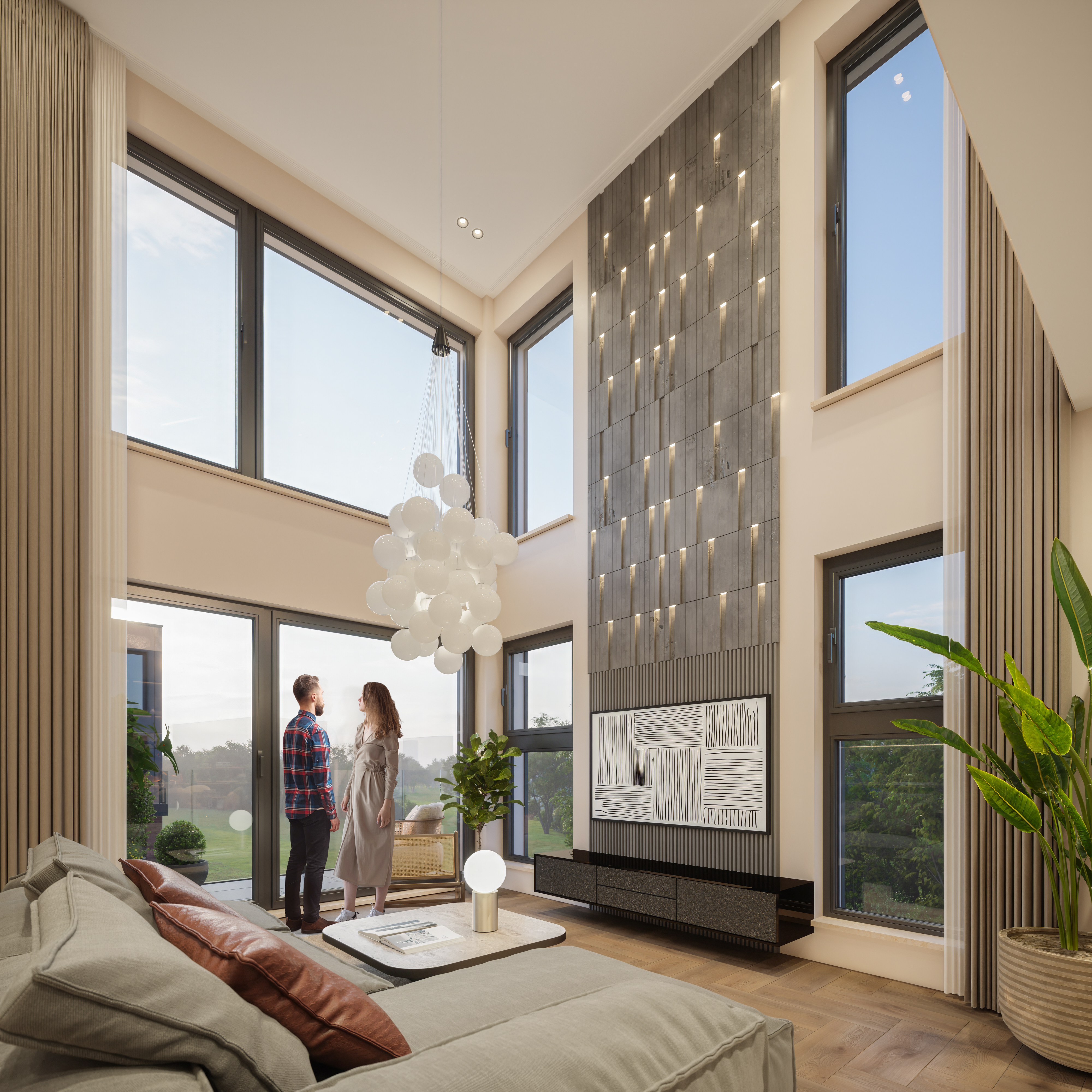 To cecha charakterystyczna naszych inwestycji. Zarówno w salonach, jak i w głównej sypialni, stosujemy duże, bezszprosowe okna, które zapewniają optymalne doświetlenie i otwierają przestrzeń.